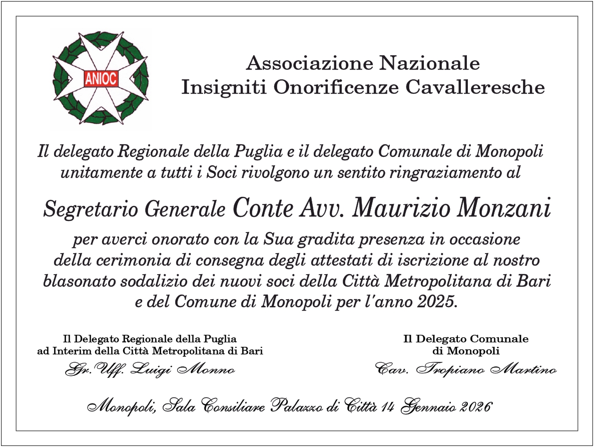 UN INCONTRO CON I NUOVI ISCRITTI ANIOC DELL’ANNO 2025 DEL COMUNE DI MONOPOLI E DELLA CITTA’ METROPOLITANA DI BARI E BAT . IL SINDACO DI MONOPOLI DOTT. ANGELO ANNESE HA INCONTRATO IL SEGRETARIO GENERALE CONTE AVV. MAURIZIO MONZANI RICEVENDOLO INSIEME AGLI ORGANIZZATORI DELL’EVENTO. NELL’’INCONTRO MOLTO CORDIALE IL SINDACO HA ESPRESSO IL SUO PERSONALE RINGRAZIAMENTO ED A NOME DELLA CITTADINANZA PER AVER PRIVILEGIATO LA CITTA’ DI MONOPOLI DELLA SCELTA DELL’EVENTO DE QUO. IL SEGRETARIO GENERALE SI E’ SOFFERMATO SU ALCUNI CENNI STORICI DELL’ANIOC E IL DELEGATO REGIONALE DELLA PUGLIA GR. UFF. LUIGI MONNO HA RIBADITO CHE LA SCELTA DELLA CITTA’ DI MONOPOLI E’ STATA UNA INIZIATIVA CONDIVISA CON IL DELEGATO ANIOC CAV. MARTINO TROPIANO CHE HA SEGUITO CON DOVIZIA DI ATTENZIONE E MINUZIOSAMENTE GLI ASPETTI ORGANIZZATIVI. LA GIORNATA E’ INIZIATA CON L’INAUGURAZIONE DELLA SEDE DELL’ANIOC DI MONOPOLI SITA IN VIA NINO BIXIO N. 264